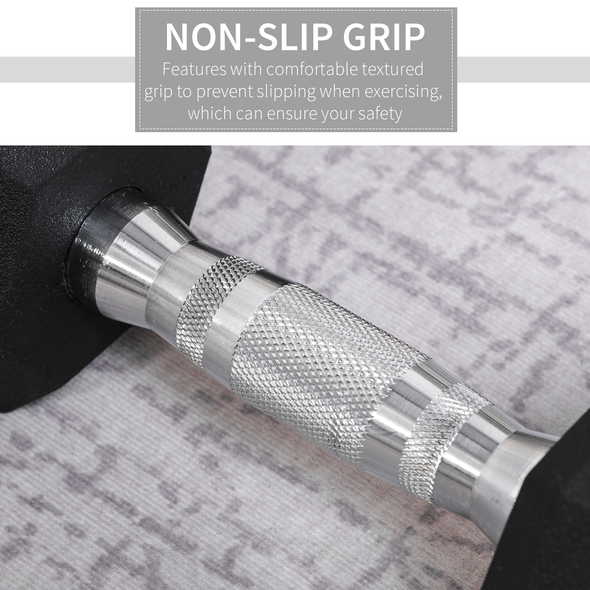 Rubber covered ends for safety when dropped, hexagon shape stops weight rolling