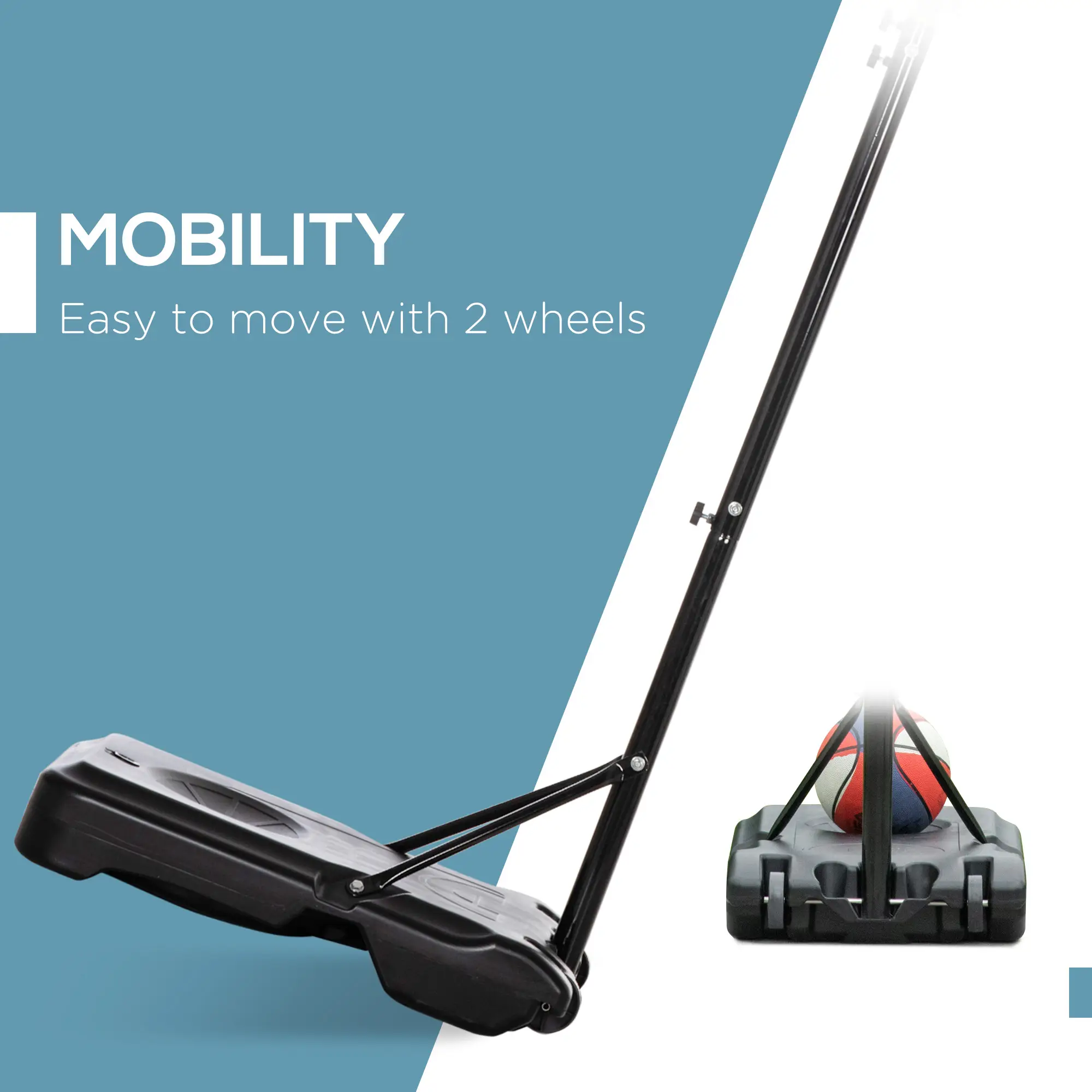 ExcerptThe 10ft Elite Series Basketball Hoop Stand with wheels features a sturdy design with a height adjustment system from 8ft to 10ft. Built for durability with a rebound system, portable on wheels, and a weighted base, it's perfect for both casual play and serious practice.