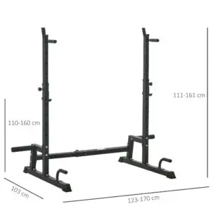 Dimensions: 111-161H x 123-170L x 103Wcm. Barbell squat rack:110-160H x 67-114Wcm