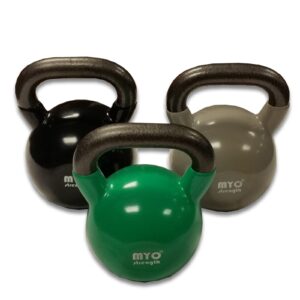 The MYO Strength Vinyl Coated Advanced Kettlebell Set, featuring weights of 20kg, 24kg, and 28kg, is designed for advanced users aiming to build strength and endurance. This set’s heavy weights challenge experienced athletes, supporting intense training regimens like HIIT and functional fitness. With color-coded, vinyl-coated bells, users can quickly identify weights, and the smooth handles provide a secure, comfortable grip.